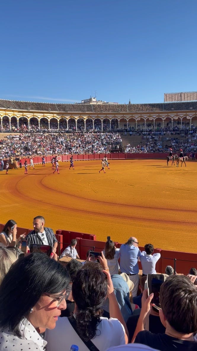 The performance is a full 4-act drama. Maybe a tragedy. Somehow a comedy too. It’s indisputably beautiful and grand. An opening number with a dozen or so bovine creatures and faithfully-costumed, equivalently well-fed riders saunter through the ring. The pageantry is precise and somehow maintained even when the bull enters and begins to run. The matador and his lil homies, each with their own feather-adorned spears and hidey-holes in the wall, engage in the choreographed torture as a team. They send the poor creature sprinting around the ring, taking the off-blade through the spine every now and then to season it like a cast-iron skillet before the final kill.